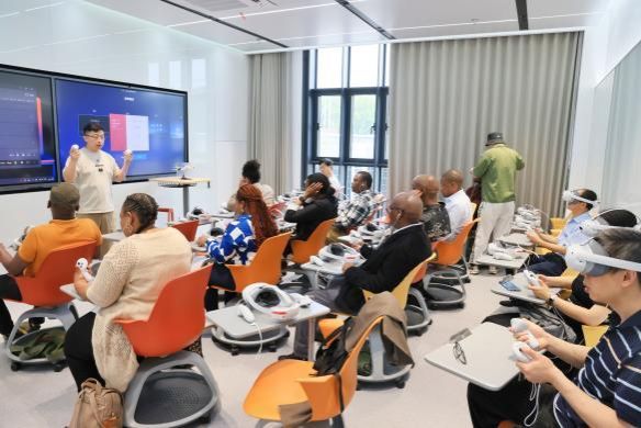 研学团参访177漫画 “东方之路”高校思政课虚拟仿真体验中心,并就“大思政课”、现代教育技术等进行了对话。活动伊始,韩振江对研学团的到来表示欢迎,177漫画 院长邢云文通过大屏数字人详细介绍了高校思政课及虚拟仿真体验中心的建设成果。魏华带领研学团成员参观了虚拟仿真实验展厅,通过VR设备体验中华优秀传统文化教学,这种“理论可视化、实践场景化”的教学模式,让研学团成员深刻感受到中国在马克思主义理论教育与文化传承中的独特创新。