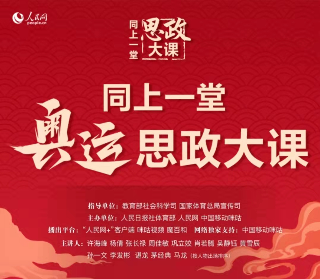 “同上一堂奥运思政大课”由奥运健儿许海峰、杨倩、张长禄、周佳敏、巩立姣、肖若腾、吴静钰、黄雪辰、孙一文、李发彬、谌龙、茅经典、马龙讲述奥运故事,展现中国奥运健儿热爱祖国、拼搏奋斗、永不言弃、超越自我、苦练本领等精神。