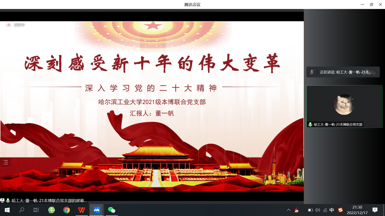 哈尔滨工业大学土木工程学院2021本博联合党支部的董一帆同志带来题为《深刻感受新十年的伟大变革》的主题宣讲。他从党的二十大报告的文本出发,围绕政治、经济、文化、社会等多个方面的伟大历史变革进行了细致分析。