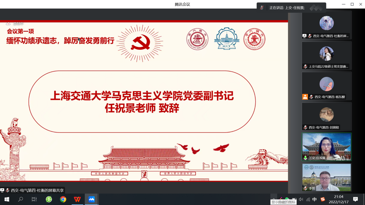 党委副书记任祝景参与党日活动并致辞,马克思主义理论2022级硕士生党支部全体党员参加线上交流学习。