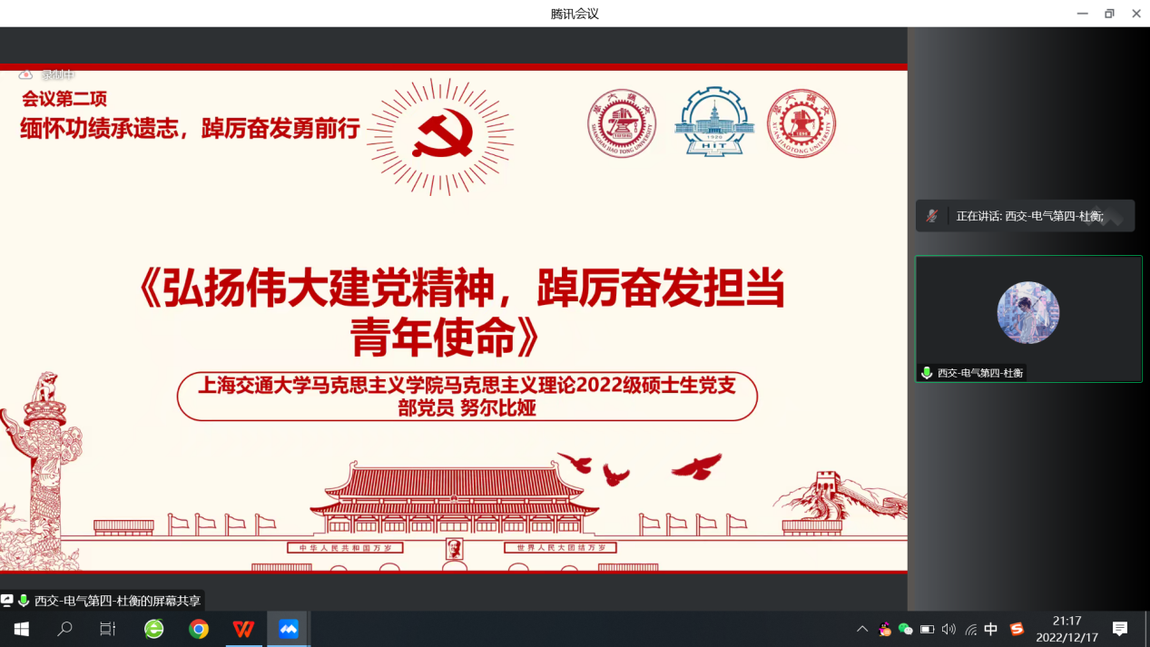 最后,西安交通大学电气学院南洋书院师生联合第四党支部书记张舒媛总结发言。她寄语三校学子要自信自强,培养思辨精神,努力做到不负时代、不负韶华、不负党和人民的期望。同时希望各支部在交流分享中共同发展、共同提高。