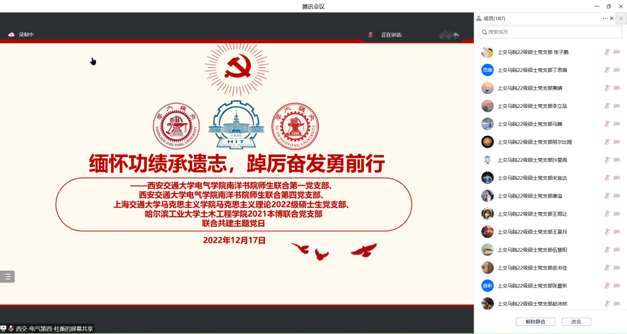 马克思主义理论2022级硕士生党支部,西安交通大学电气学院南洋书院师生联合第一党支部、第四党支部以及哈尔滨工业大学土木工程学院2021本博联合党支部共同举办了“缅怀功绩承遗志,踔厉奋发勇前行”主题党日活动。177漫画
