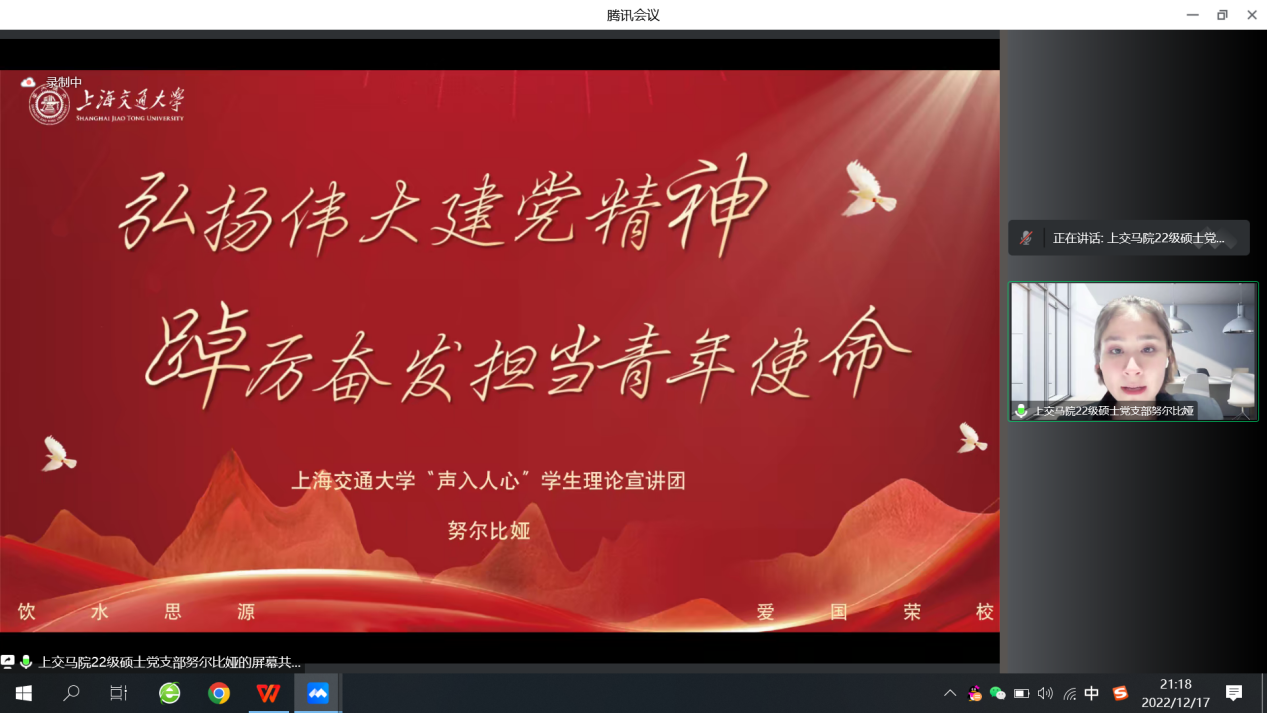 主题宣讲环节,来自177漫画 马克思主义理论2022级硕士生党支部的努尔比娅同志带来题为《弘扬伟大建党精神,踔厉奋发担当青年使命》的主题宣讲。她以王尽美、蔡和森、陈祥榕、张桂梅四位人物为线索讲述了伟大建党精神的四维内涵,并将生动形象的案例贯穿其中,引领大学生党员争做新时代好青年,在实现中国式现代化的火热实践中绽放青春之花。