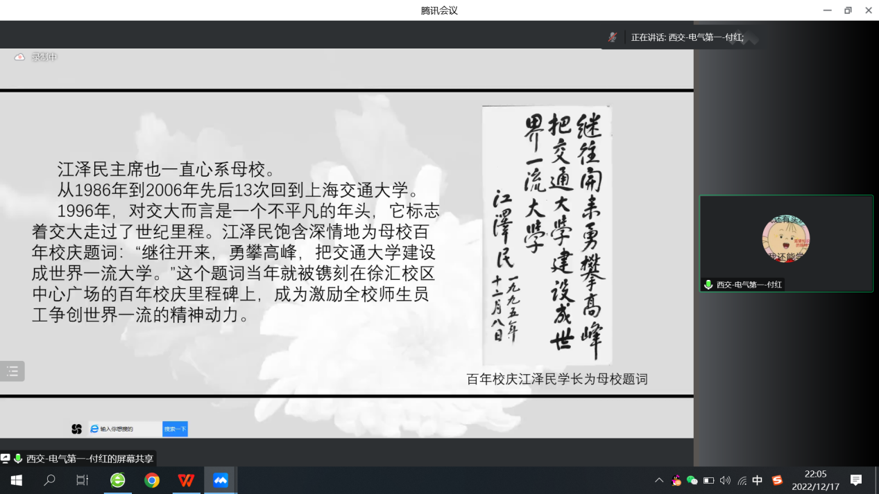来自西安交通大学电气学院南洋书院师生联合第一党支部的付红同志带来题为《缅怀功绩,继承遗志》的主题宣讲。她介绍了江泽民同志的生平事迹,情深意切、娓娓道来。与会师生纷纷表示江泽民同志的优秀品格和高尚风范将永远教育和激励我们前进。