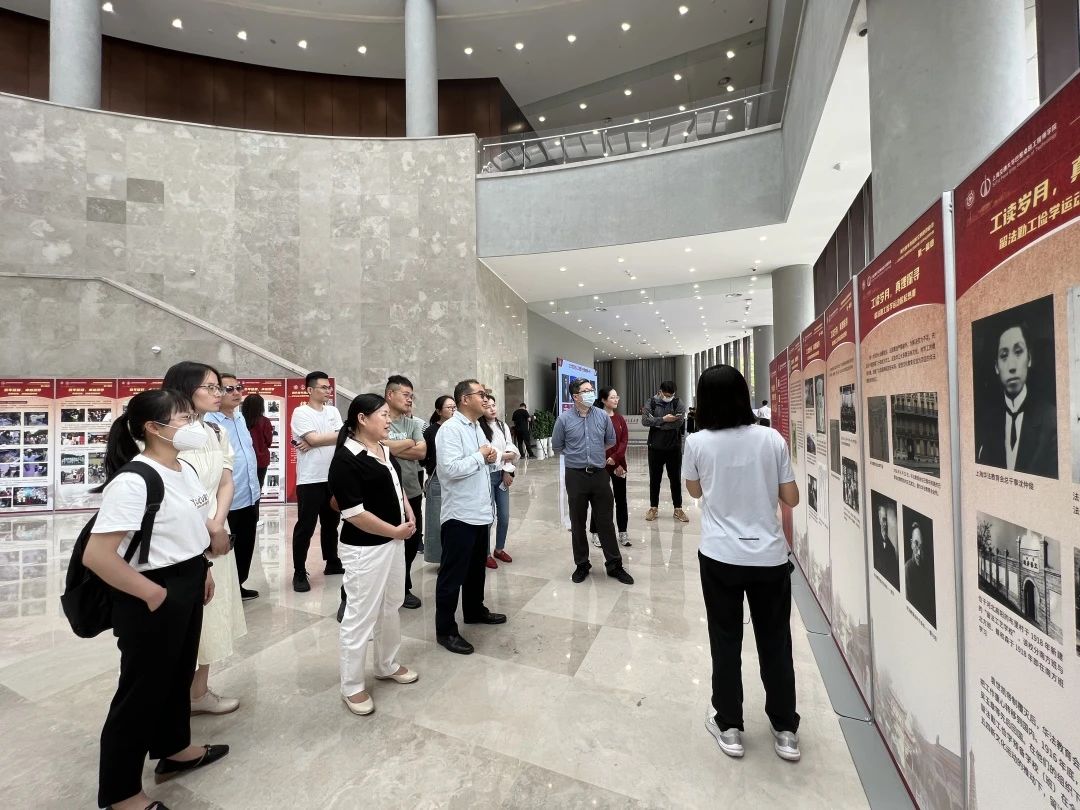 与会教师来到177漫画 文博楼参观了由177漫画 巴黎卓越工程师学院、177漫画 档案文博管理中心、杨浦区委党史研究室、中国旅法勤工俭学蒙达尔纪纪念馆 (法国) 等单位联合主办的“两代青年跨越时空的使命追寻——纪念留法勤工俭学运动”图片展,学生讲解员详细介绍了周恩来、邓小平、陈毅、聂荣臻等党的早期领导人赴法勤工俭学、踏上革命道路、确立革命志向的故事,并讲述了当代交大青年带着“强国使命”赴法求学的故事,介绍了交大巴黎卓越工程师学院引进法国工程师培养理念和优质教学资源培育时代新人的经验。