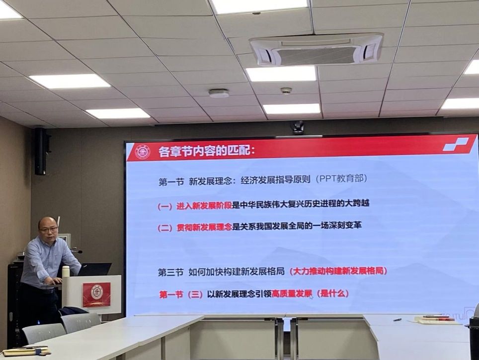 随后,王强展示了第六章《推动高质量发展》的教学设计。王强从教材体系、学习要点方面分析了第六章的框架结构,认为第六章的重点是讲清楚两个问题:第一,是讲清楚一个逻辑关系,即新发展阶段、新发展理念、新发展格局与高质量发展之间的关系;第二,是讲清楚一个热点问题,即如何推动新质生产力的发展。王强还就“新观点、新提法的引入与原体系关系的把握”、“各知识点之间的侧重关系与讲授重难点”等方面进行了交流探讨。