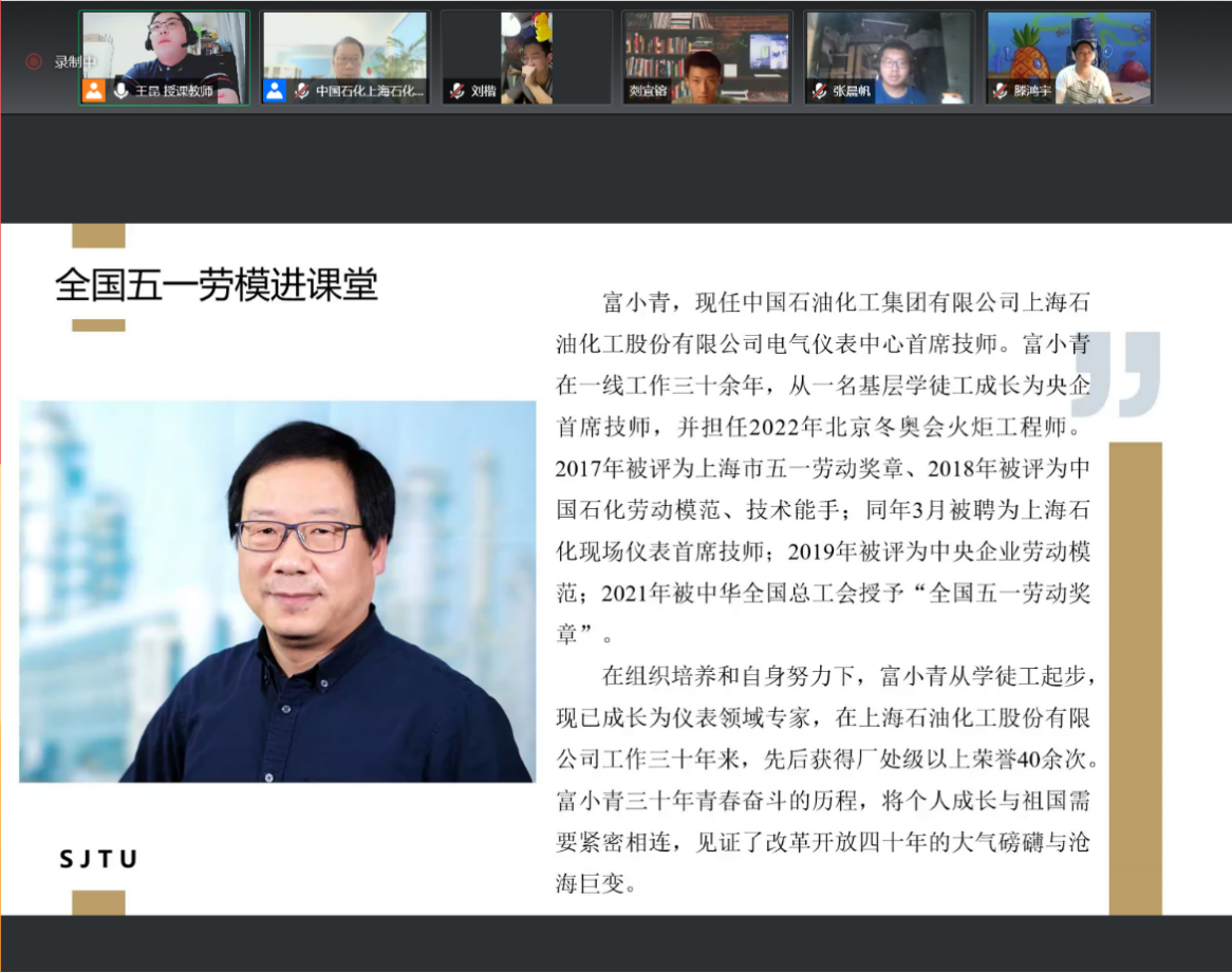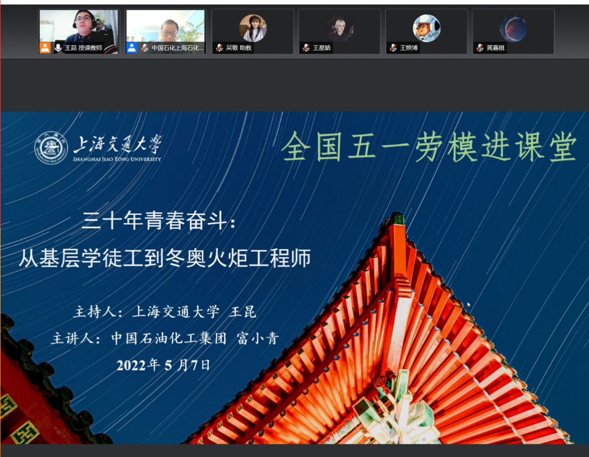 在“五一”国际劳动节和“五四”青年节到来之际,5月7日,全国五一劳动奖章获得者富小青首席技师走进交大思政课课堂,讲述其从一名一线学徒工成长为冬奥火炬工程师的青春奋斗故事。富小青用自身丰富的案例为当代大学生诠释了爱岗敬业、争创一流、艰苦奋斗、勇于创新、淡泊名利、甘于奉献的劳模精神,提升了交大本科生思政课的授课体验和实践视野。