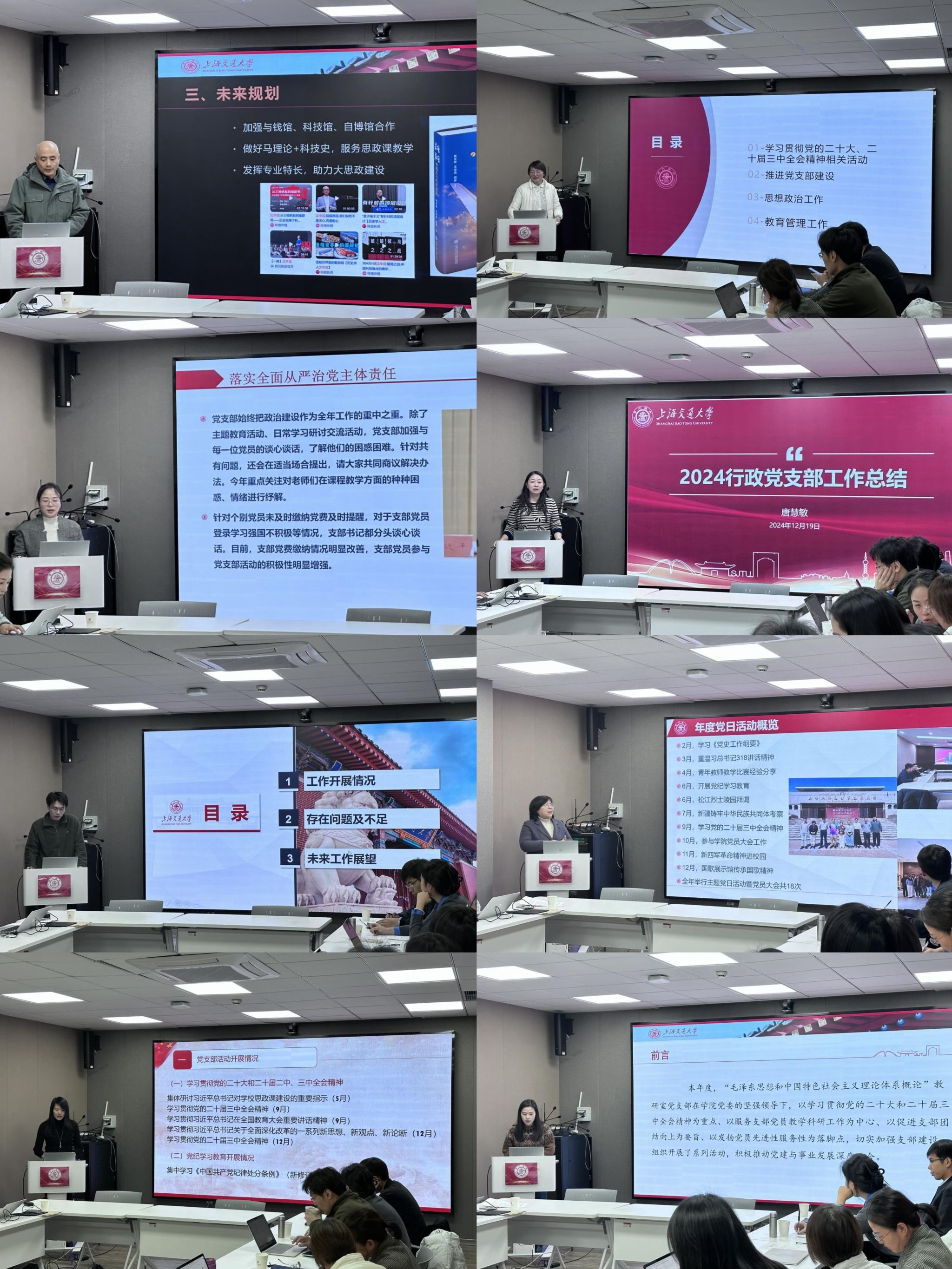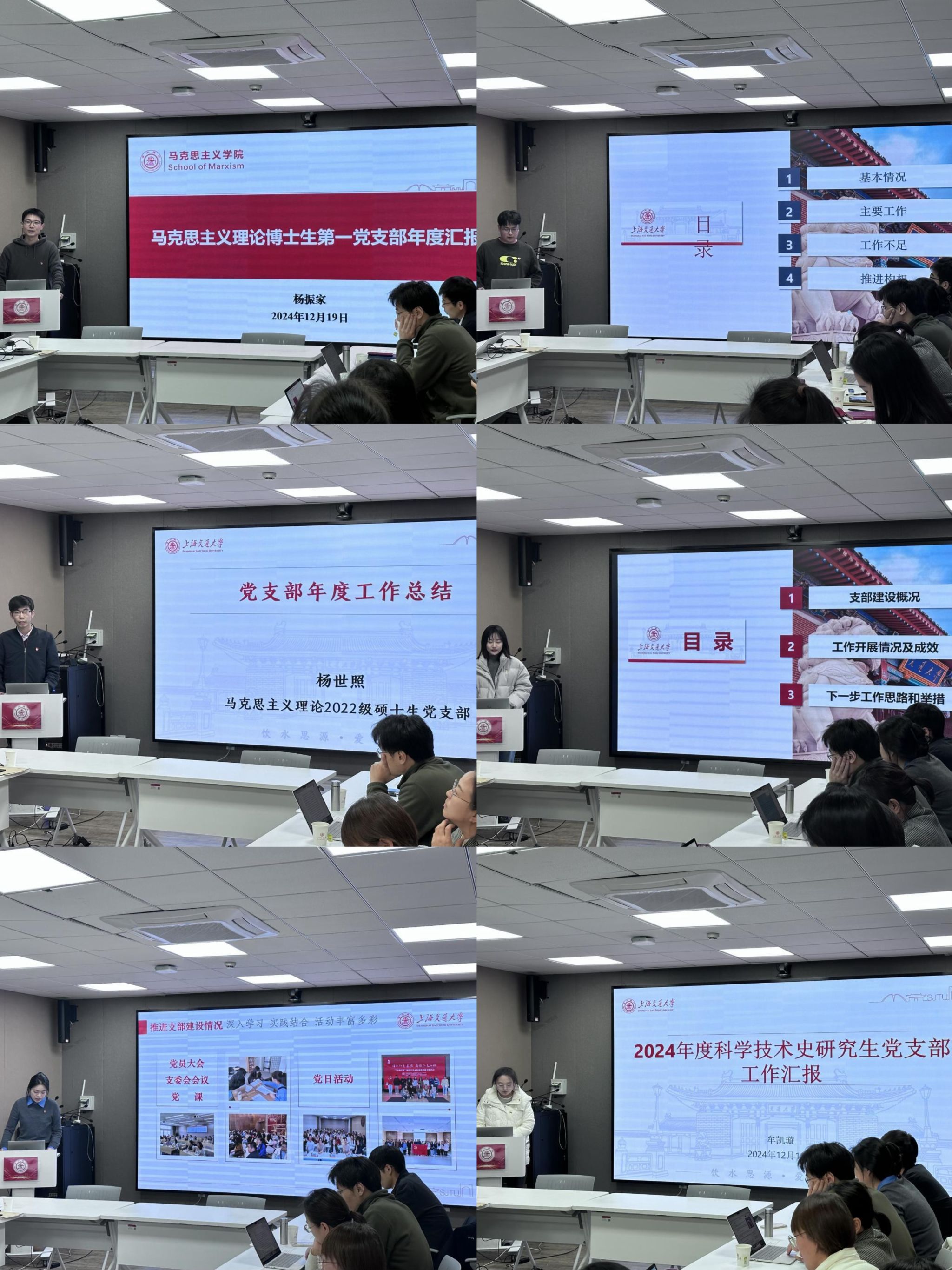 会上,9位教工党支部书记和6位学生党支部书记聚焦贯彻党支部工作条例、党员教育管理工作条例精神,党员教育管理监督服务、党的组织生活、基层党组织按期换届、党组织议事决策机制,以及落实党中央、市委决策部署和学校党委决定、联系服务群众等情况展开述职,同时查摆支部工作存在的问题与不足,并对2025年党支部工作进行了展望。