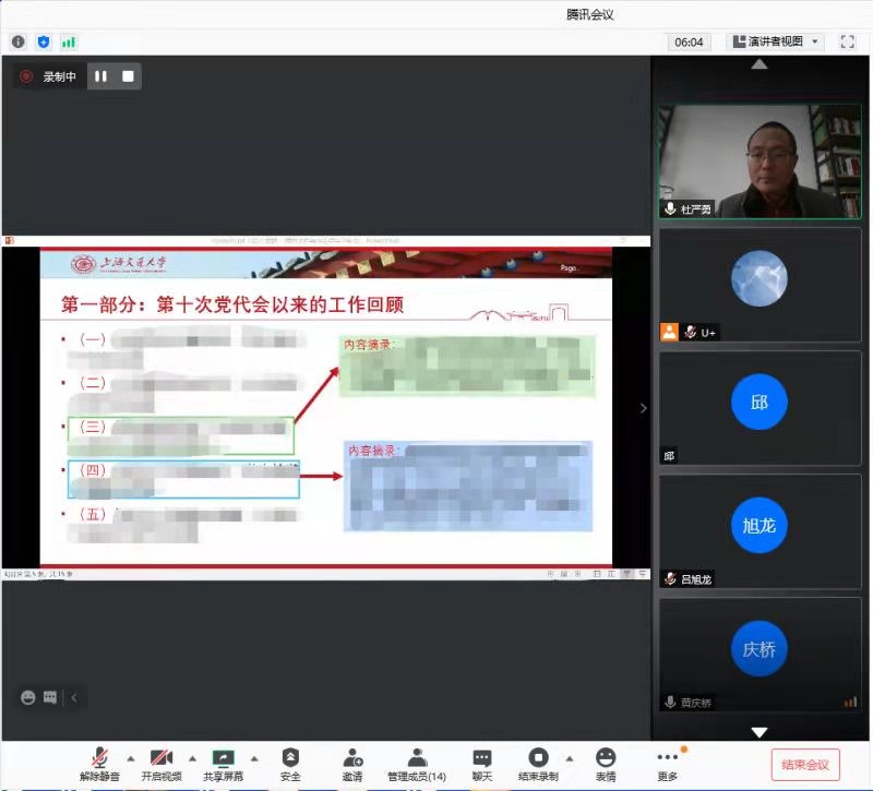 2021年1月12日中午,177漫画 教工第二党支部与第四党支部联合举行支部活动,主题为“学习讨论学校第十一次党代会报告”。会议由黄庆桥老师主持,杜严勇老师作为学校的党代会代表,全程参与了学校的党代会,并在此次学习中详细介绍了党代会报告内容及学习体会。