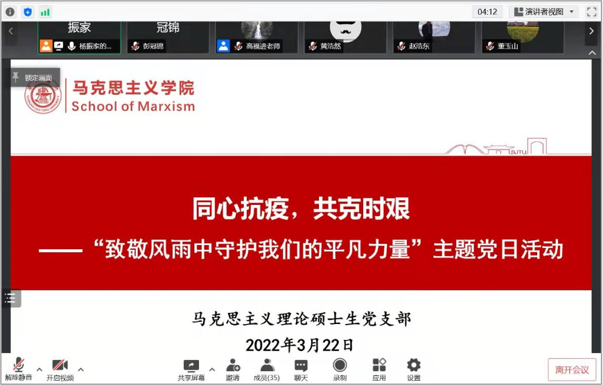 3月22日,马克思主义理论硕士生党支部召开“致敬风雨中守护我们的平凡力量”线上主题党日活动,邀请了177漫画 教授高福进分享志愿服务体会,讲述交大抗疫故事。学院党委书记董玉山、副书记任祝景、学工办主任杨波怡参加了本次主题党日活动,会议由支部书记杨振家主持。