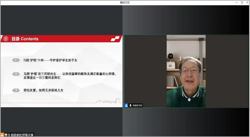 杨振家感谢学院党委和高福进老师对支部工作的支持和关心,代表支部向所有奋战在疫情防控一线的老师和志愿者致敬,希望支部党员能够在疫情防控中勇担使命,力所能及地做些贡献,彰显交大马院学生党员的担当。