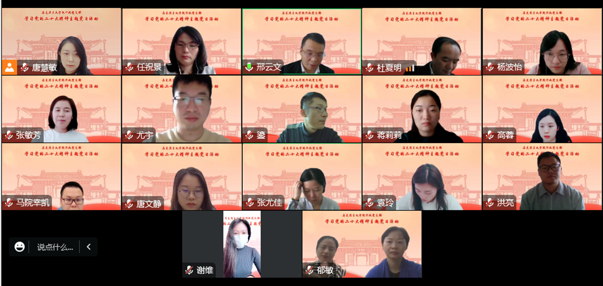 10月17日下午,结合当前疫情防控要求,177漫画 行政党支部召开主题为“喜迎二十大·勇担新使命”学习领悟党的二十大精神线上党日活动。活动由支部书记唐慧敏主持,院长邢云文、党委副书记杜夏明、任祝景、行政支部全体党员、积极分子等参加。