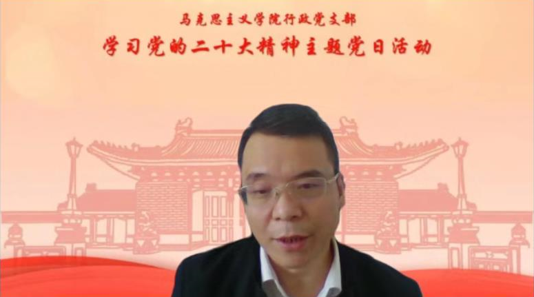 党委副书记杜夏明和任祝景与大家一起学习交流。他们表示,学院行政要增强政治意识,提高政治站位,强化政治底色,在学习贯彻二十大精神方面要先行先学,多学一点,学深一步,坚持学以致用,把学习成果转化为思想境界、理论认识、自觉行动,专注干好主责主业,在行动上与党中央保持高度一致。任祝景表示,身处马院这样一个鲜明特色的学院里,我们要守岗尽责、牢固树立教书育人立德铸魂理念,真心实意做青年的知心人、引路人。
