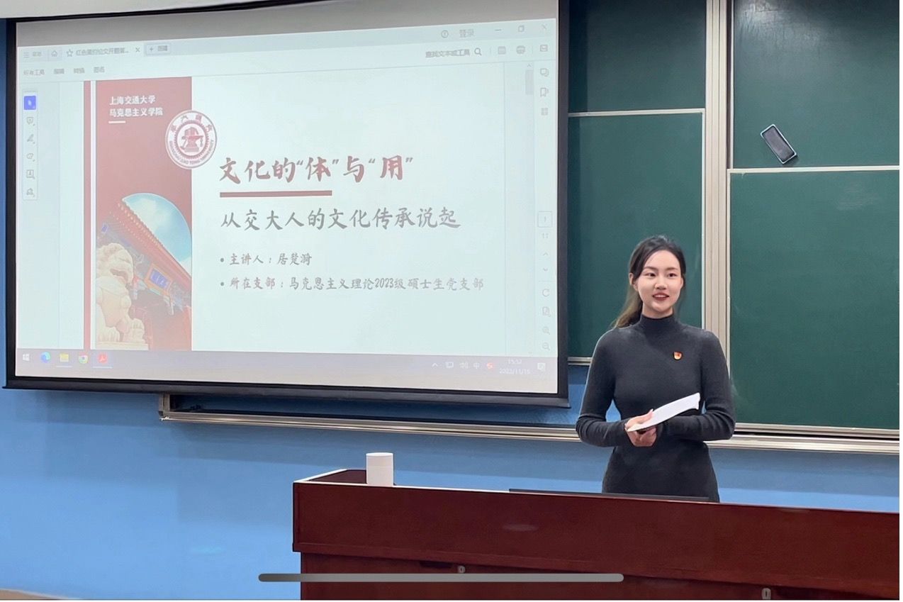居楚漪以《文化的“体”与“用”——从交大人的文化传承说起》为题,立足于习近平文化思想的理论背景,围绕交大校徽的历史变迁,讲述了文化传承中“体”与“用”的关系逻辑,阐释了“明体达用,体用贯通”的文化研究态度,启示同学们在对待传统文化时采用正确的分析方法和应用手段。