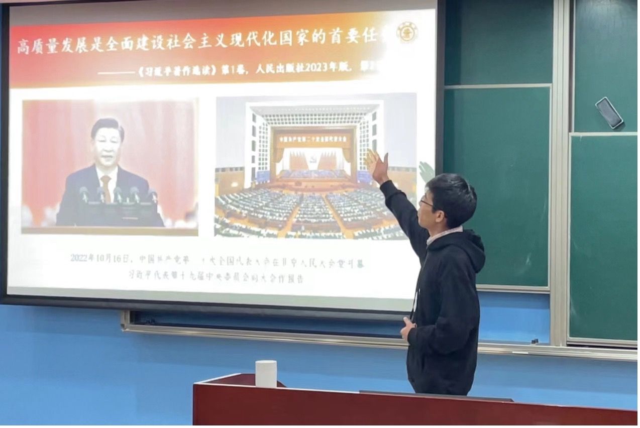 在支部书记讲党课环节,杨世照以《争做高质量发展中的有为青年党员》为题,讲述了要把握国家发展的新时代历史背景、学习榜样人物的奋斗路径与奋进精神、自觉承担马院学子与青年党员的身份责任,以理论融入实践,做奋发有为的青年党员。
