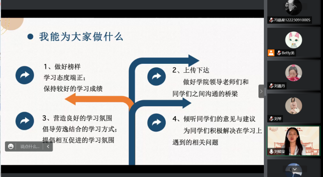 会议进行了班委竞选。30名班委候选人以不同形式风格进行介绍,同学们分别从“个人工作经历”“兴趣特长”“工作优势”等方面进行展示交流。会议气氛热烈,青春洋溢。经投票,选举班长冯晶星,团支部书记丁思薇,学习委员朱丽莎等8名班委。希望担任班委的同学尽职尽责,在服务同学中收获成长。